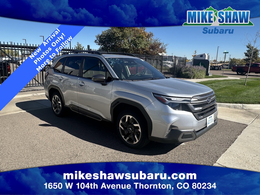 26/33 City/Highway MPG 4-Wheel Disc Brakes, ABS brakes, Air Conditioning, Alloy wheels, Auto High-beam Headlights, Automatic temperature control, Brake assist, Dual front impact airbags, Dual front side impact airbags, Electronic Stability Control, Emergency communication system: MySubaru Safety (3-year free trial), Exterior Parking Camera Rear, Front anti-roll bar, Front dual zone A/C, Front fog lights, Fully automatic headlights, Heated door mirrors, Heated Front Bucket Seats, Heated steering wheel, Illuminated entry, Knee airbag, Leather steering wheel, Outside temperature display, Overhead airbag, Panic alarm, Perforated Leather-Trimmed Upholstery, Power driver seat, Power Liftgate, Power moonroof: Panoramic, Power passenger seat, Radio: Subaru 11.6 Multimedia Plus System, Rear anti-roll bar, Remote keyless entry, Security system, Speed control, Split folding rear seat, Spoiler, Steering wheel mounted audio controls, Telescoping steering wheel, Tilt steering wheel, Traction control, Trip computer, Turn signal indicator mirrors.Ice Silver Metallic 2025 Subaru Forester Limited Pkg42 AWD